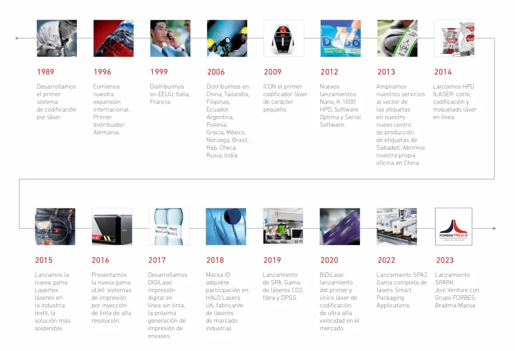 Macsa ID has its origins in the company Framun, a manufacturer and distributor of rubber stamps that was founded in Manresa in 1908. In 1983, taking advantage of the latest advances in coding and marking technologies, it was established as an independent line of the company, dedicating itself to the sale, supply and service of coding products for Spain. In 1989, Macsa ID started to investigate the potential of laser coding and marking technology in Spain, and subsequently, in 1995, its role as industry leader in terms of marking and integration of coding systems had already been consolidated. From 1996 onwards, the equipment developed by Macsa ID began to be distributed in Germany and after only a decade was present in 18 countries worldwide. Since then, the continued progress of the company has allowed annual and biennial launches.